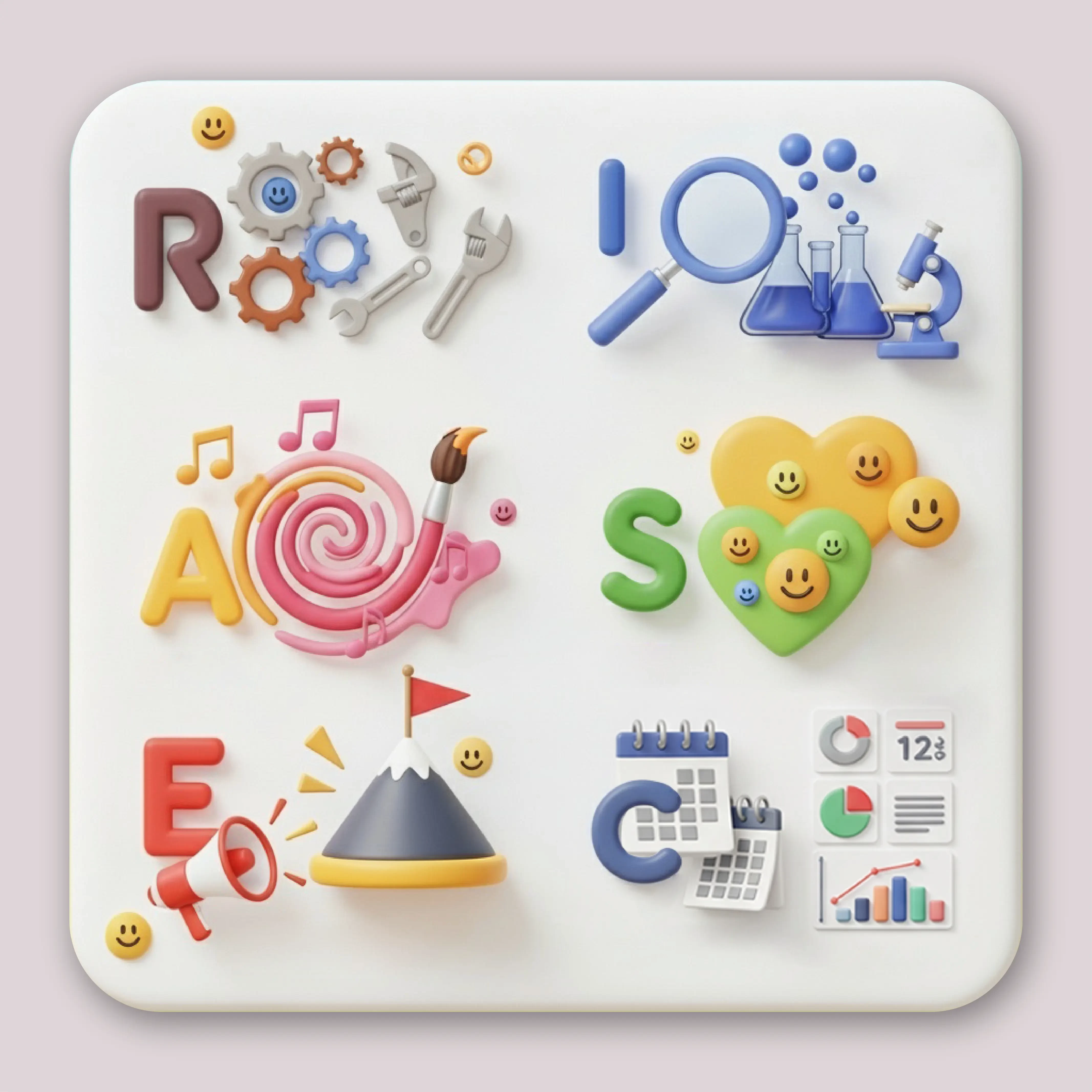 R - Realistis: "Para Pelaku." Orang yang praktis, aktif, mekanis, atletis. Mereka lebih suka bekerja dengan alat, mesin, alam, dan benda. Lingkungan: Keterampilan, teknik, pertanian, pekerjaan fisik.